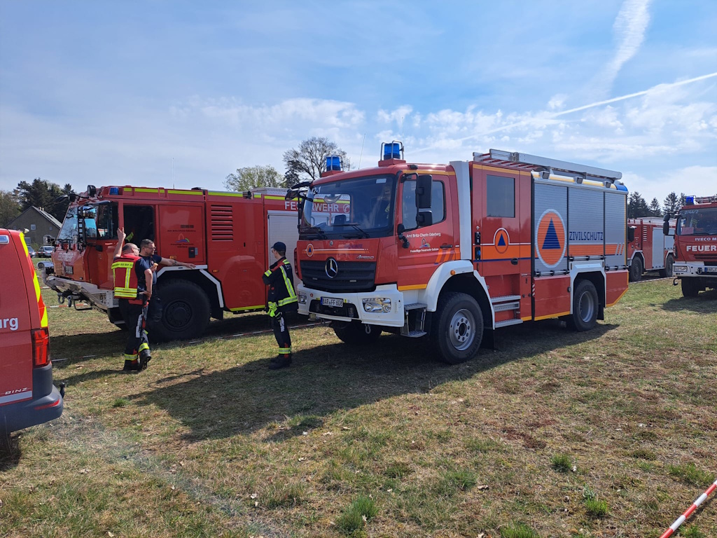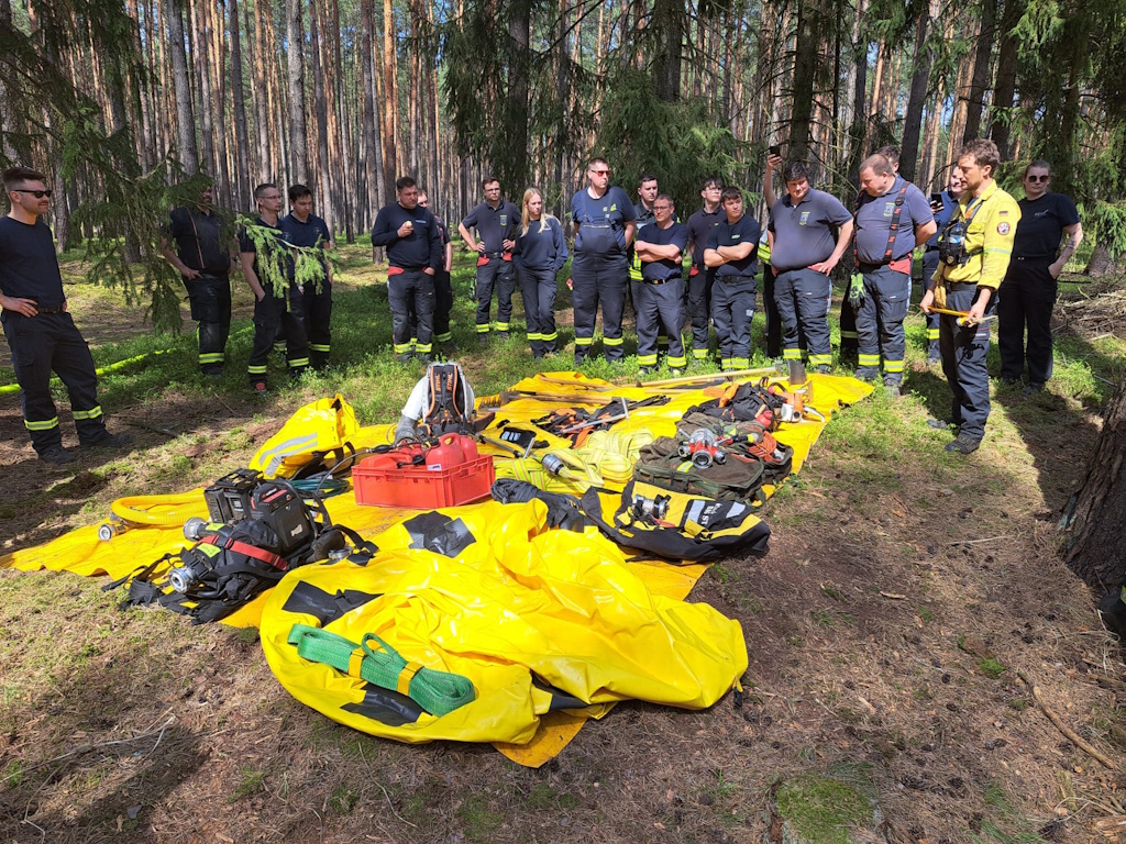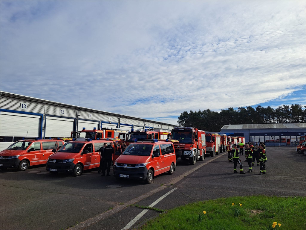 Selbstverständlich muss das Zusammenspiel für solche Einsatzlagen immer wieder geübt werden. Aus diesen Gründen fand vom 16. bis 19. April 2026 eine große Waldbrandübung in der Rüthnicker Heide statt, die durch die Landkreise Ostprignitz-Ruppin und Oberhavel organisiert wurde. Dabei wurde vor allem das Zusammenspiel von Feuerwehren aus mehreren Landkreisen mit Polizei, Bundeswehr und anderen Hilfsorganisationen wie dem Technischen Hilfswerk (THW) und Deutschen Roten Kreuz (DRK) geprobt. Insgesamt waren rund 800 Einsatzkräfte daran beteiligt. Um die dabei gewonnenen Erkenntnisse zu vermitteln, wurden auch die Brandschutzeinheiten der umliegenden Landkreise eingeladen. So konnten den Feuerwehrleuten die neuen technischen Möglichkeiten zur Waldbrandbekämpfung präsentiert werden. Daher erfolgte nach einer kurzen Begrüßung und Lageeinweisung auf dem Gelände des Zentrums für Brand- und Katastrophenschutz im Eberswalder Stadtteil Nordend der geschlossene Abmarsch von knapp 20 Einsatzfahrzeugen der Barnimer BSE unter Nutzung von Sonder- und Wegerechten (Blaulicht und Sirene) nach Rüthnick. Dies stellte bereits einen wichtigen Teil der Übung dar, denn der Verband musste in Anlehnung an eine echte Einsatzfahrt unter anderem den Eberswalder Stadtverkehr am Samstagvormittag passieren. Nachdem diese erste Hürde problemlos gemeistert worden war, begaben sich die beteiligten Brandschützer in das Waldgebiet zwischen Rüthnick und Beetz. Dort waren mehrere Stationen aufgebaut, an denen unterschiedliche Themen präsentiert wurden.