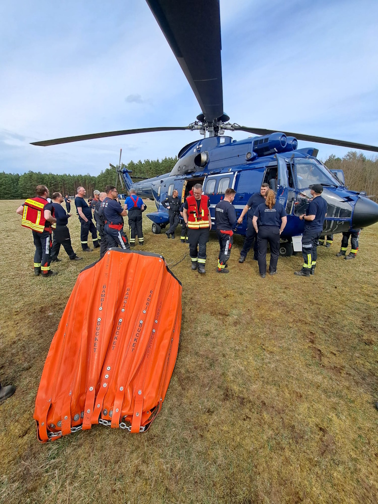 - Luftunterstützung: Mittels Drohnen können beispielsweise Einsatzgebiete effektiv erkundet und vermisste Personen aufgefunden werden. Außerdem präsentierte die Fliegerstaffel der Bundespolizei aus Ahrensfelde OT Blumberg, wie einer ihrer Hubschrauber durch ein „Bambi Bucket“ ca. 2.000 Liter Wasser gezielt zum Brandort transportieren und dort abwerfen kann.