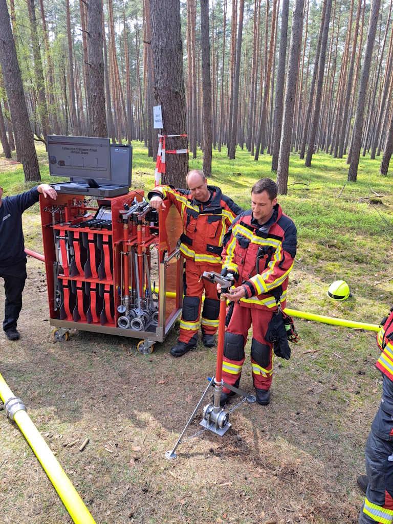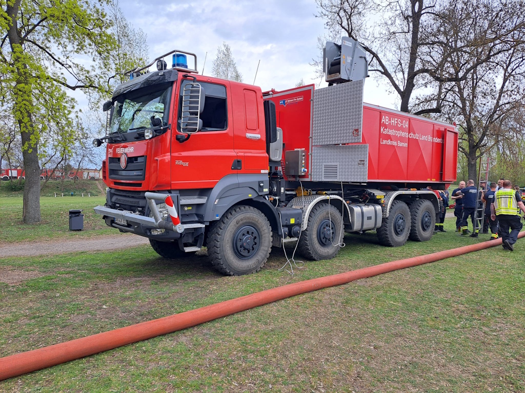 - Hochleistungsfördersystem (HFS): Mittlerweile befinden sich fünf HFS-Einheiten im Land Brandenburg, wobei eine in den Barnimer Gemeinden Panktetal und Ahrensfelde stationiert ist. Sie ermöglichen die Förderung von großen Wassermengen, was bei Waldbränden von großer Wichtigkeit ist. Die bei der Übung im Einsatz befindlichen HFS-Einheiten stellten somit die Wasserversorgung für die anderen Stationen sicher, indem sie kilometerlange Schlauchleitungen durch den Wald legten.